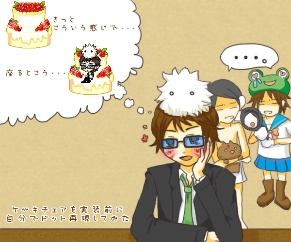 ファンアート ファンアート 新着 ランキング 殿堂入り キャラクター名: 郁島 ワールド: かえで 冒険手帳を見る 他の作品を見る 自分で再現「ケーキチェア」 日付:2010.01.21 12:03 表示回数:947 郁島「はーっ・・・早く実装されないかなぁ・・・」 充電(後ろ右側)「郁島、気色悪いな・・・」 凡後原(後ろ左側)「キモいこと山のごとしだな」 充電「一発フライパンで殴ってもいい?」 凡後原「おk」 郁島「(なんか悪寒が・・・)」 いつになるかはわからないけども実装されることが嬉しすぎて 思わず再現絵を描いてみました。 関係ないけどおしゃべり広場のユーザーイベント告知のところで ロトくじ主催してますー、ぜひぜひご参加下さい(´ω`) スタンプを押す スタンプ(11) ことのは 小梅わぉん xピヵピヵx ペポリーヌ 弩っみ ダンマーク 真河ジュン 八神コウ RなぴなR キルフィスxx kurokuroki コメント コメント(8) ファンアートの一覧に戻る TOPへ