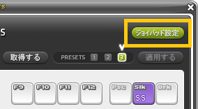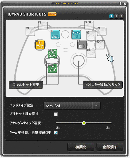 ■メイプルストーリーを起動しているPCにゲームパッドを接続している状態で、ショートカットキー設定ウィンドウの右上にある
