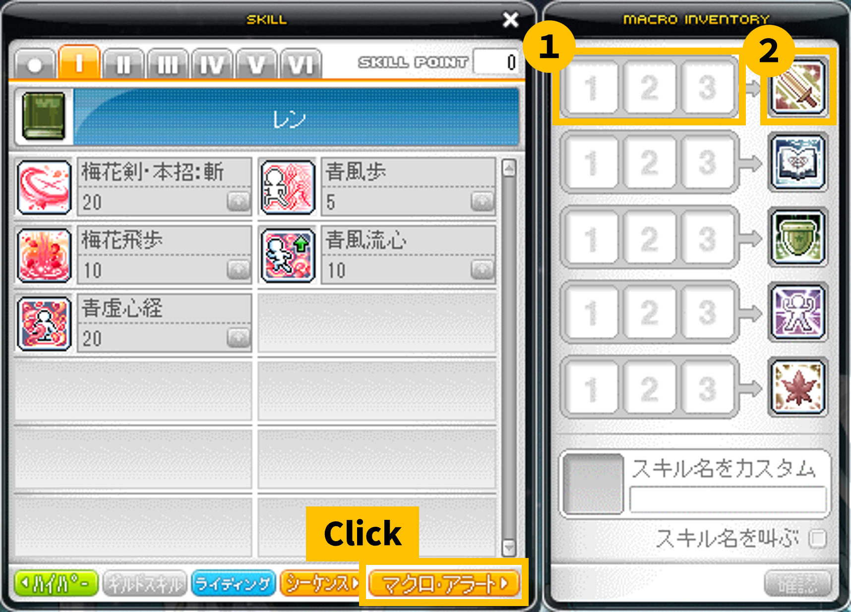 ■スキルウィンドウ(デフォルト「K」キー)右下にあるマクロ・アラートボタンから設定できます。