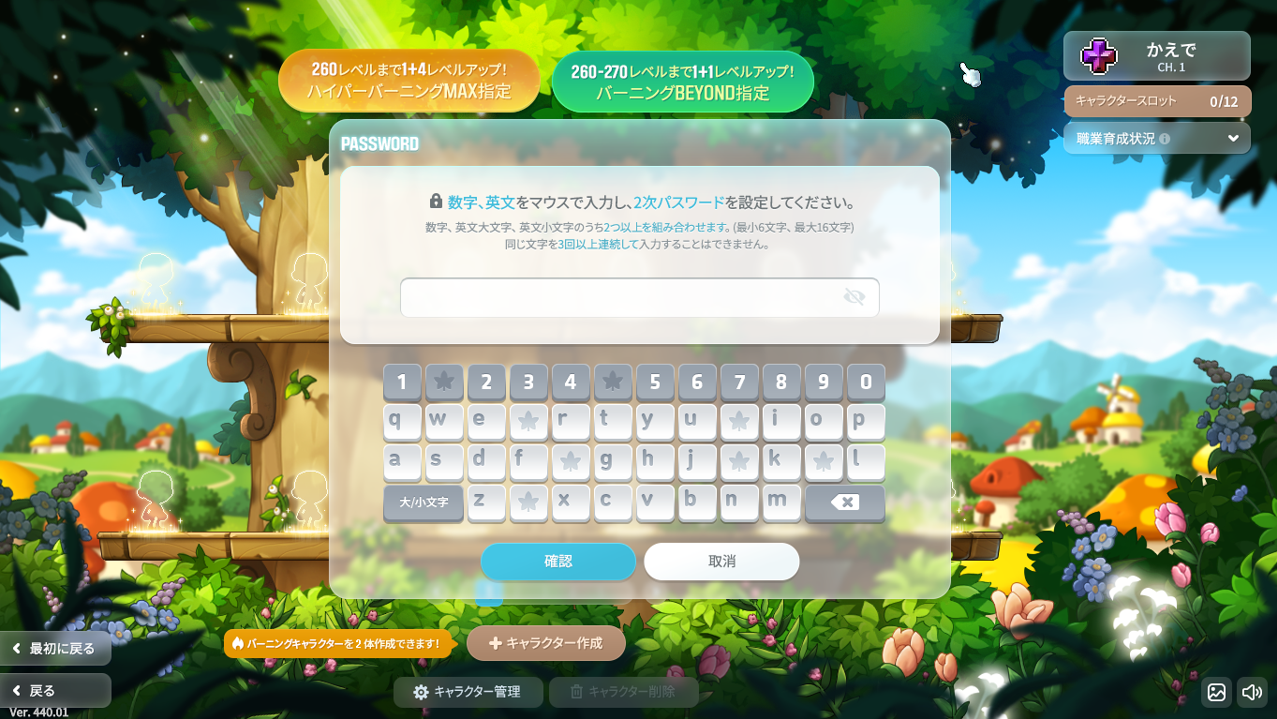 キャラクターの作成/削除からキャラクターの接続、メルマーケットを利用するために2次パスワードを入力する必要があります。