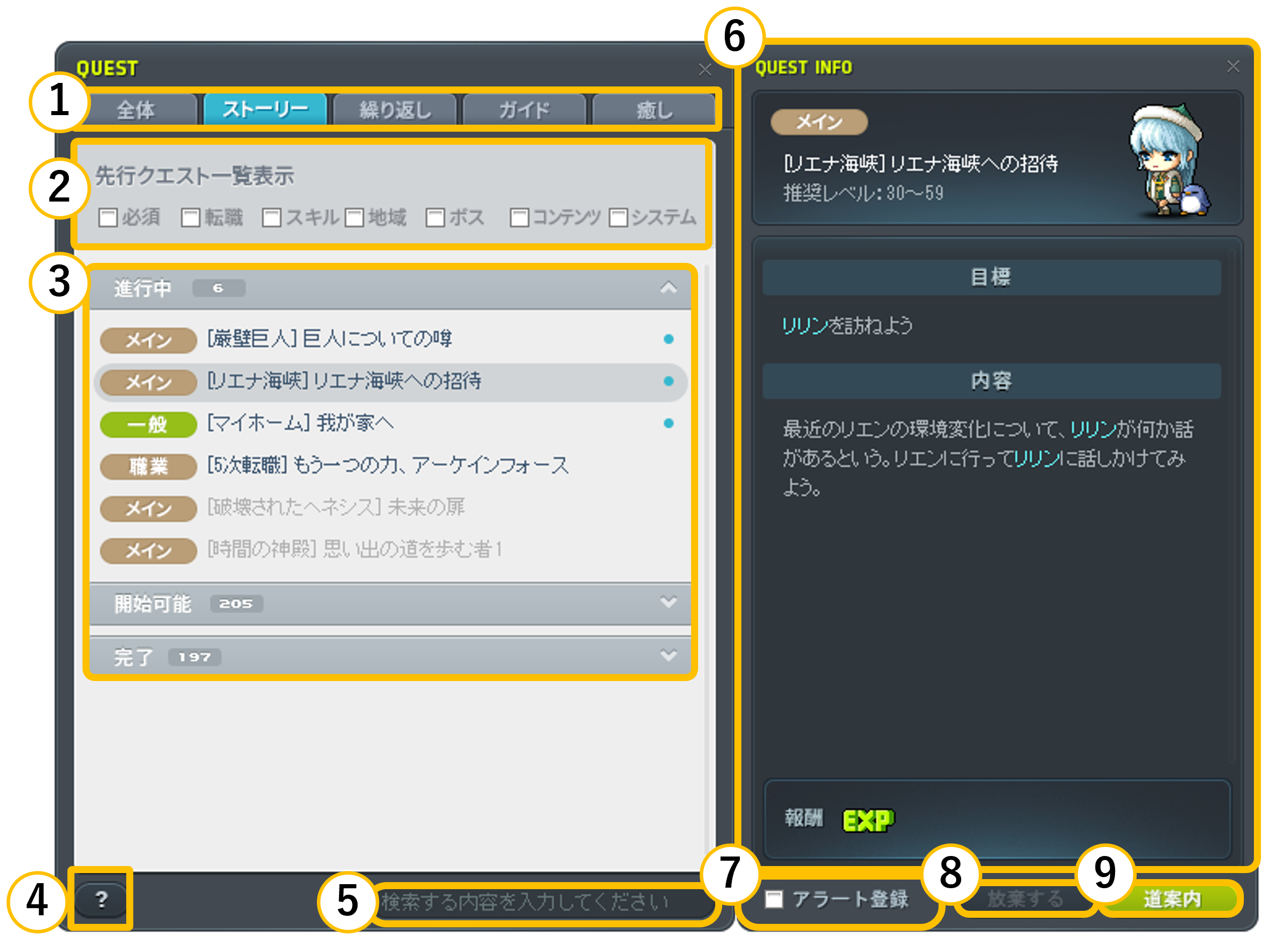 ⑧クエスト放棄 | 現在のクエストを放棄することができます。 放棄したクエストは、開始可能タブのリストから再度受けることができます。 |
