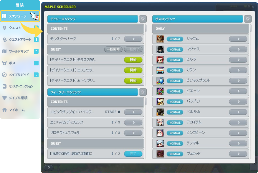 任意のクエストやコンテンツを登録しておくことで、スケジューラから開始することができます。