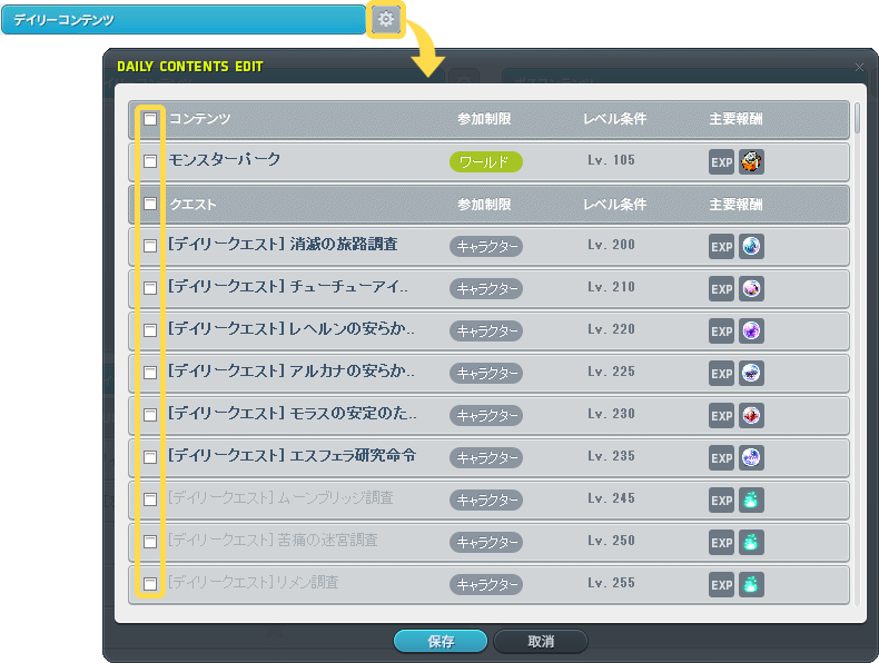- デイリーコンテンツ、ウィークリーコンテンツ、ボスコンテンツの場合は、