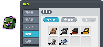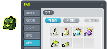 薬草や鉱石は、アイテム「植物用8マスカバン」「鉱物用8マスカバン」に収納しましょう。