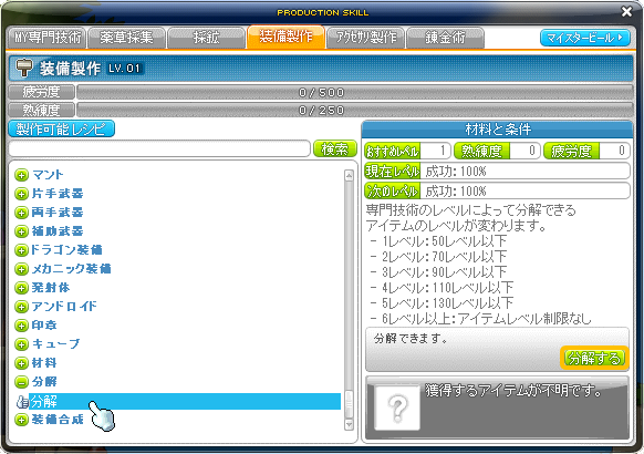 専門技術レベルが高いほど着用レベルが高いアイテムを分解できます。