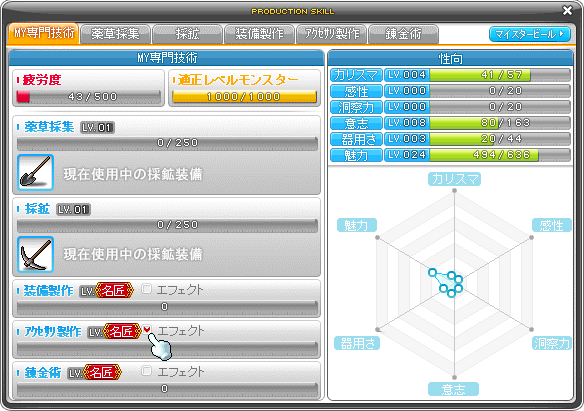 採集系(薬草採集、採鉱)と製作系(装備製作、アクセサリ製作、錬金術)に分かれ、
