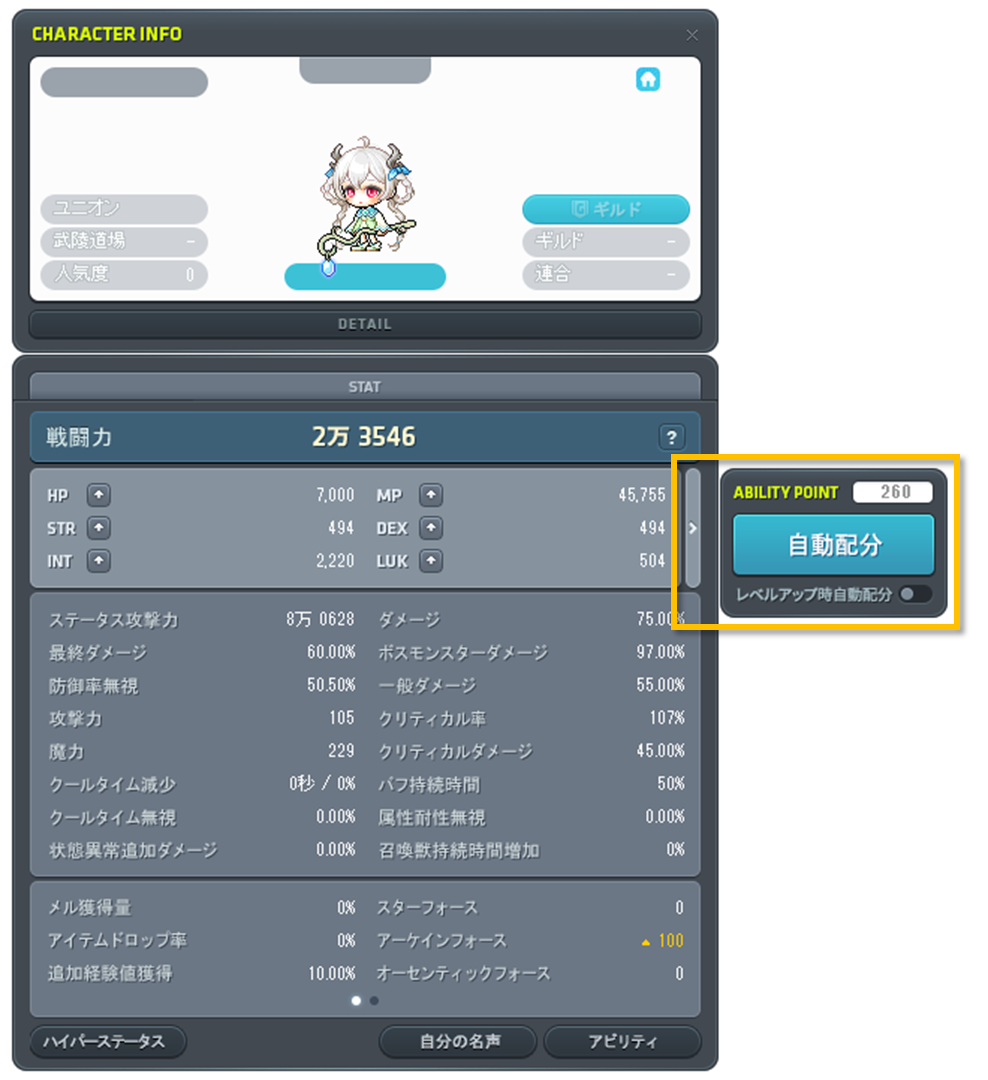 ポイントは、HP、MP、STR、DEX、INT、LUKの能力値のうち、指定した能力値に配分することができます。