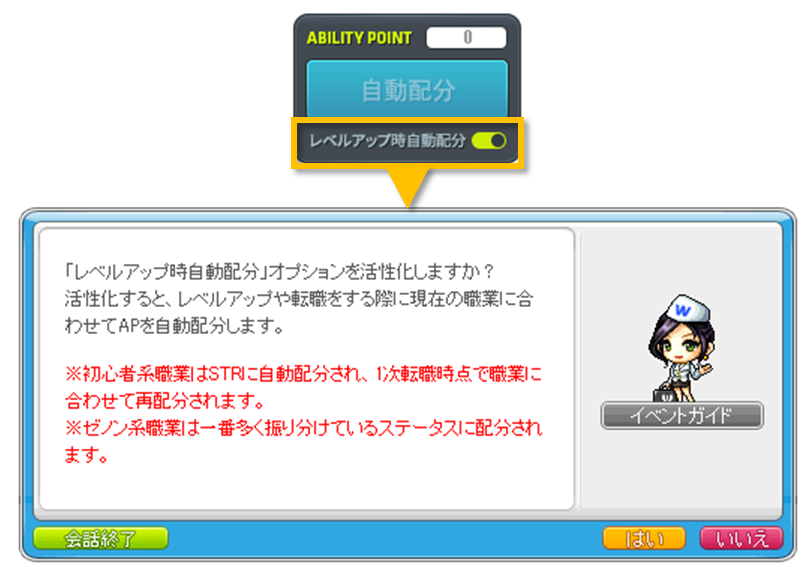 [レベルアップ時自動配分]トグルボタンをオンにすると、レベルアップおよび転職時にキャラクターに最も適した能力値へポイントが自動配分されます。