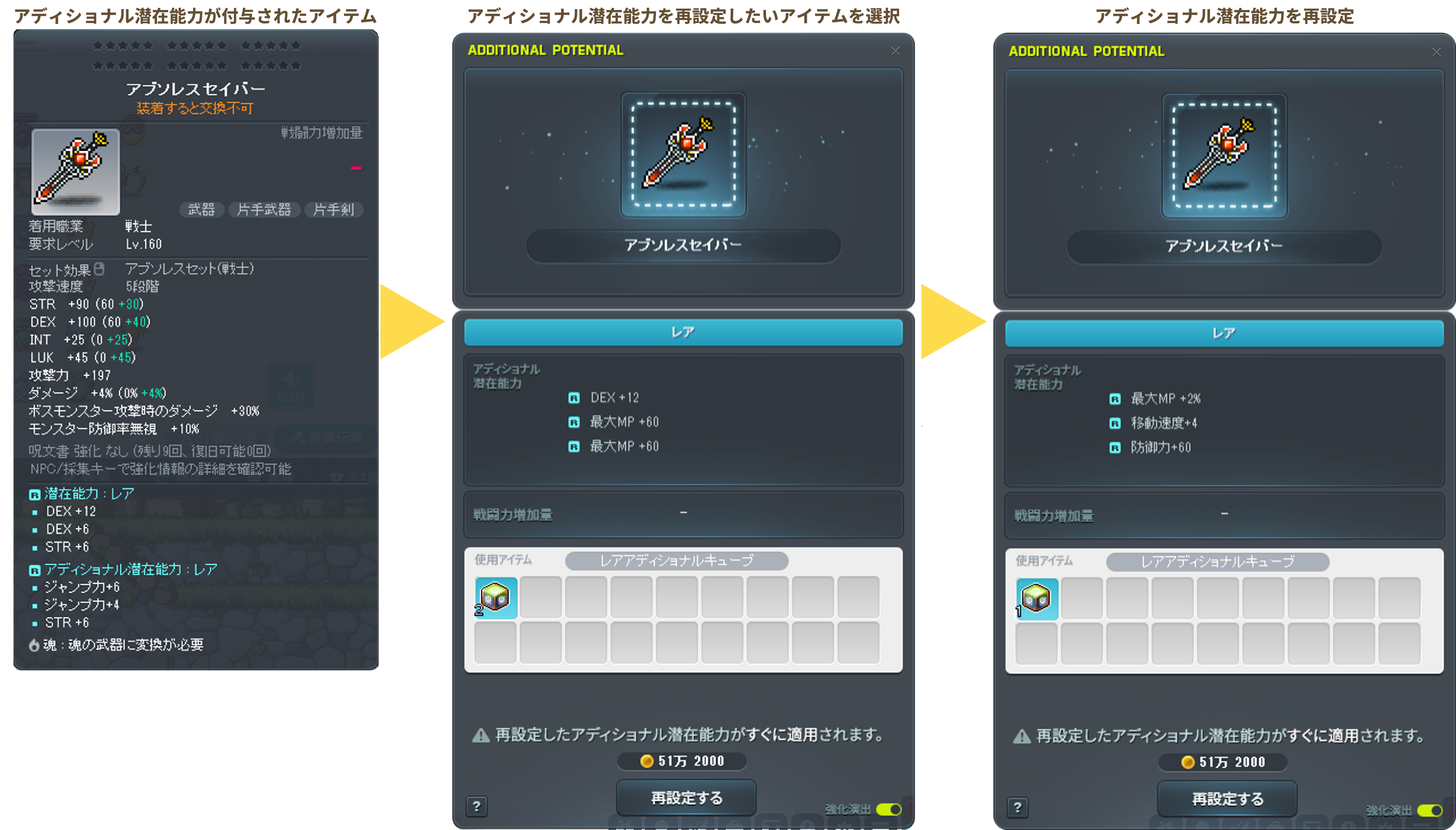 通常の潜在能力と結果が異なる場合があります。 - ・アディショナル潜在能力は潜在能力が付与されている装備にのみ付与することができます。