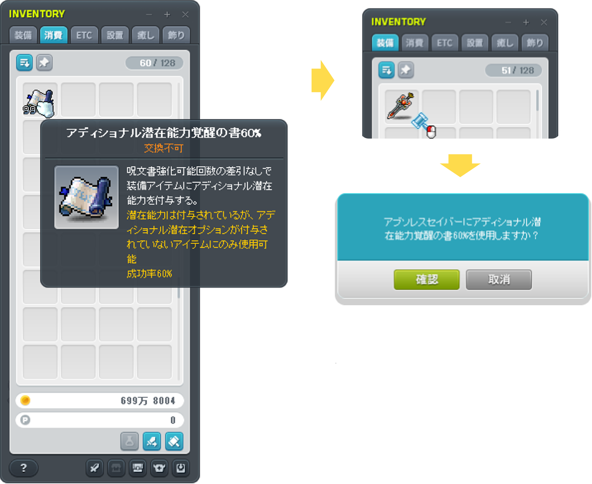 消費アイテム「アディショナル潜在能力覚醒の書」を使用してアディショナル潜在能力を付与することができます。