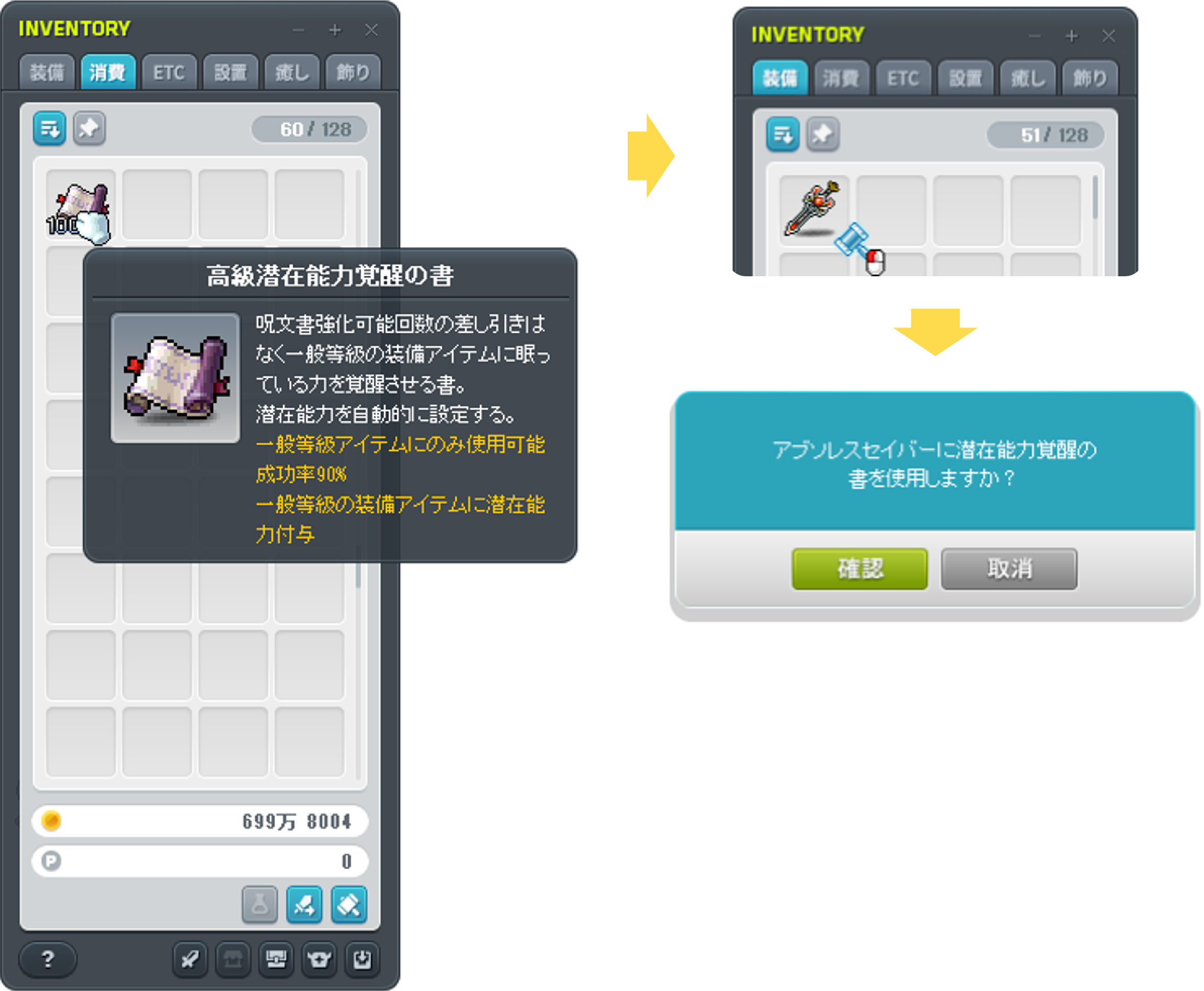消費アイテム「潜在能力覚醒の書」を使用して潜在能力を付与することができます。