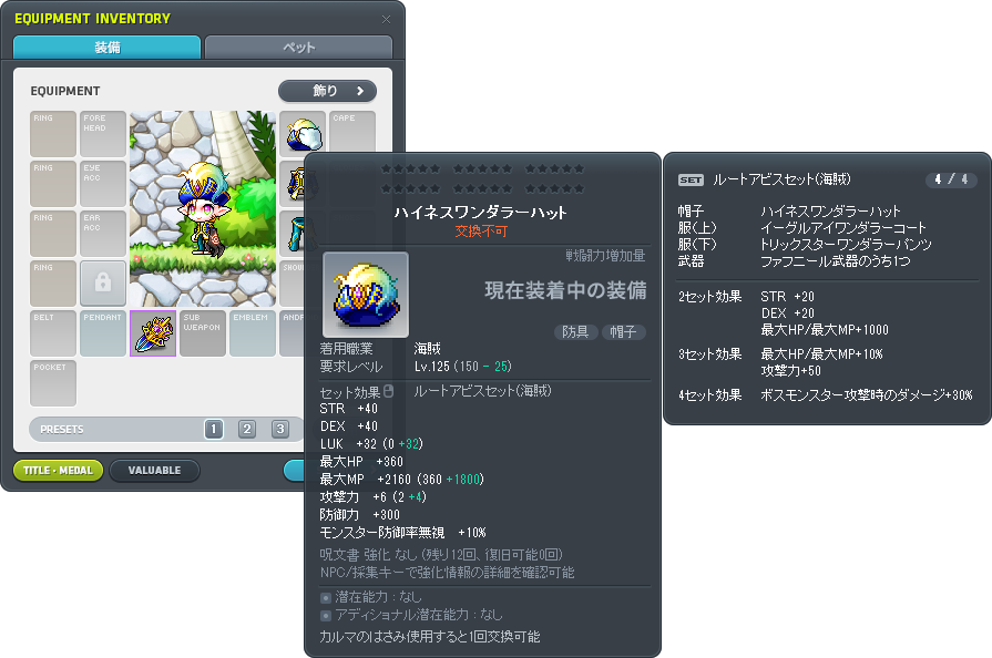 帽子 | ハイネス | 2セット効果 ・各職業のメインステータス:+20 ・各職業のサブステータス:+20 ・最大HP/最大MP:+1000 3セット効果 ・最大HP/最大MP:+10% ・攻撃力or魔力:+50 4セット効果 ・ボスモンスター攻撃時ダメージ:+30% |