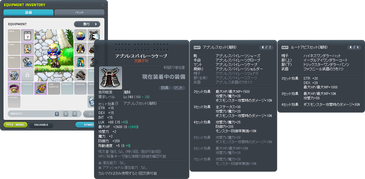 帽子 | アブソレス | 2セット効果 ・最大HP/最大MP:+1500 ・攻撃力/魔力:+20 ・ボスモンスター攻撃時ダメージ:+10% 3セット効果 ・Allステータス:+30 ・攻撃力/魔力:+20 ・ボスモンスター攻撃時ダメージ:+10% 4セット効果 ・攻撃力/魔力:+25 ・防御力:+200 ・モンスター防御率無視:+10% 5セット効果 ・攻撃力/魔力:+30 ・モンスター攻撃時ダメージ:+10% 6セット効果 ・最大HP/最大MP:+20% ・攻撃力/魔力:+20 7セット効果 ・攻撃力/魔力:+20 ・モンスター防御率無視:+10% |