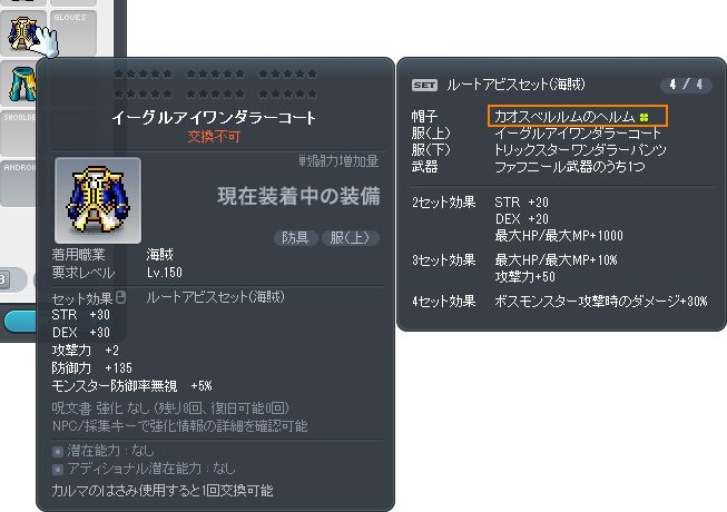 例)イーグルアイワンダラーコート(服上)+トリックスターワンダラーパンツ(服下)+ファフニールフェンリルタルロン(武器)+カオスベルルムのヘルム(ラッキーアイテム)=ルートアビス4セット効果適用