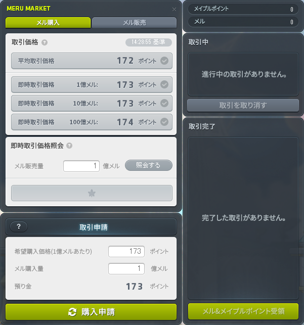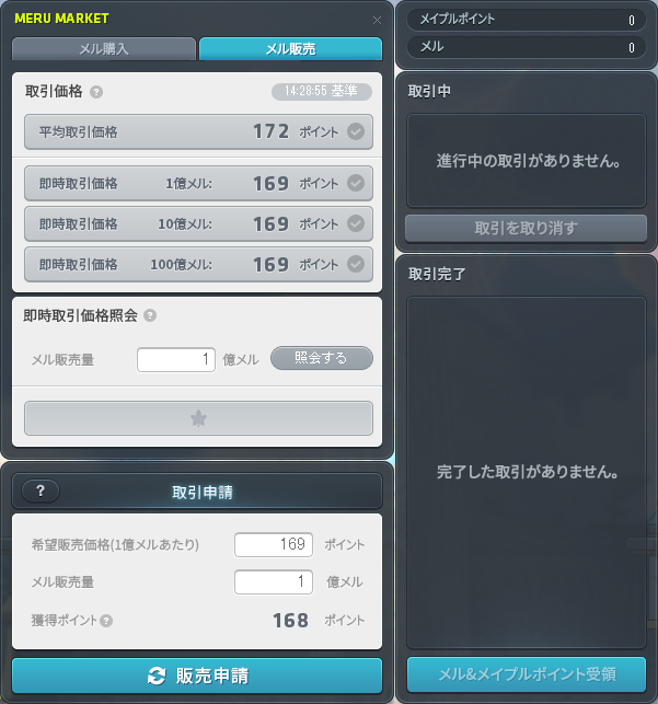 メイプルポイントは「取引完了」インベントリに戻されます。 - ・メルの購入/販売は100,000,000単位で登録できます。