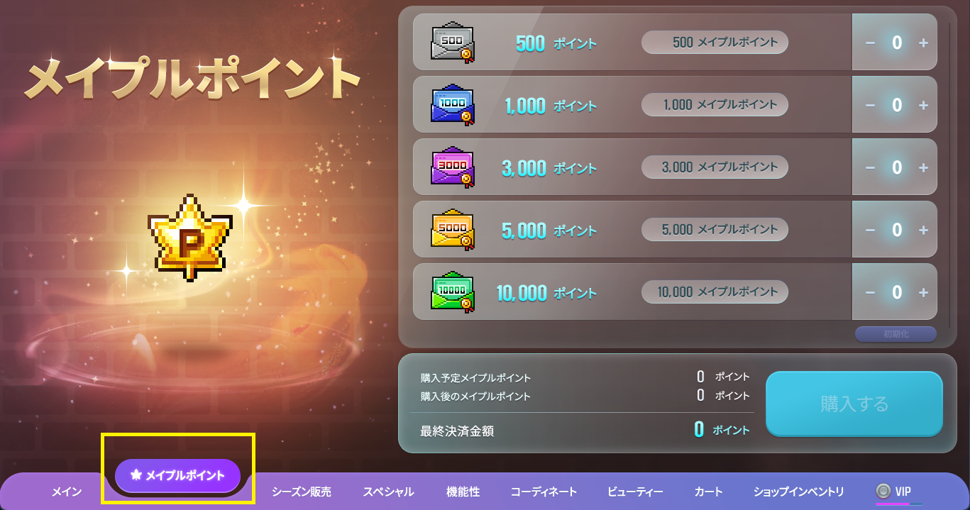 メイプルポイントが表示され、金額に応じたメイプルポイントを購入することができます。