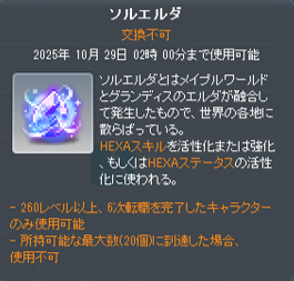 260レベル以上のキャラクターの6次転職後に必須なアイテム「ソルエルダ」と「ソルエルダの欠片」を獲得することができる課金アイテムです。