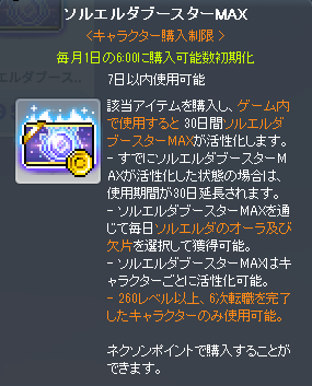 - ・ソルエルダブースターMAXは、キャラクター毎に月1個、メイプルID毎に月3個まで購入することができます。