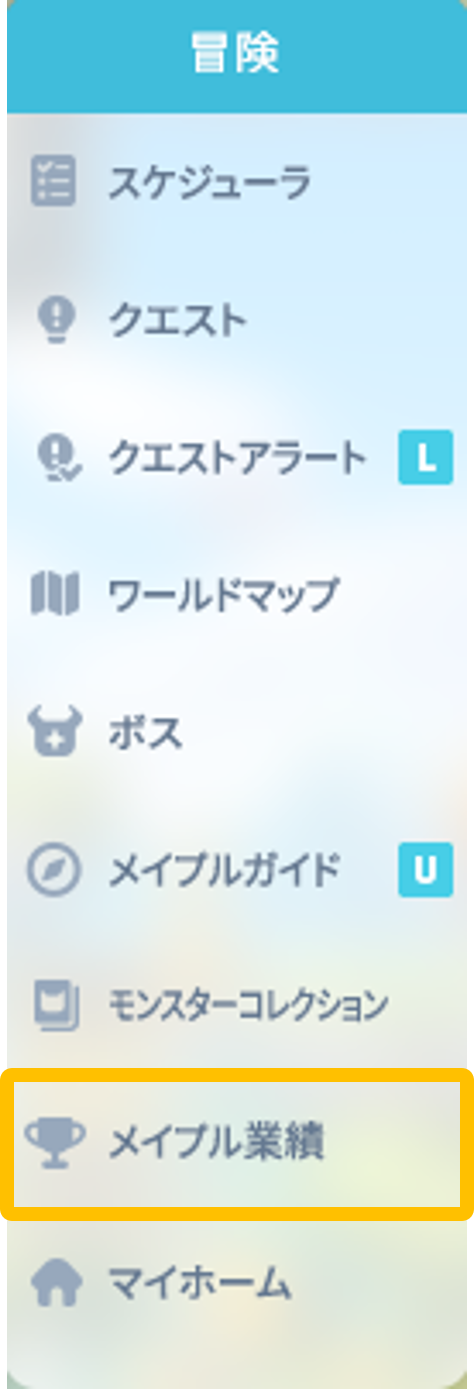 レベル33以上キャラクター、またはストーリークエストチャプター2を完了した職業「ゼロ」のキャラクターに発生するクエスト「メイプル業績の始まり」進行後に業績を確認できるようになります。
