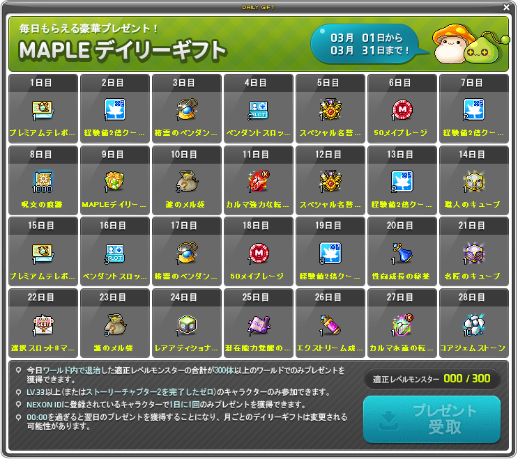 デイリーギフト報酬アイテムは毎月変更される場合があります。