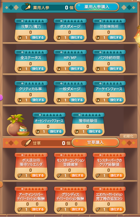 - 初期化は1回につき1,000メイプルポイントを使用し、メイプルポイントを使って獲得した薬用人参と甘草は全て返却されます。