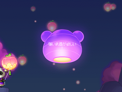 | クマさんの天灯バフアイテム | ボスモンスター攻撃時のダメージ15%増加 モンスター防御率無視15%増加 攻撃力/魔力15増加 ※効果は1時間継続 ※他の強化効果と重複可能で、再接続しても効果が維持される |