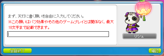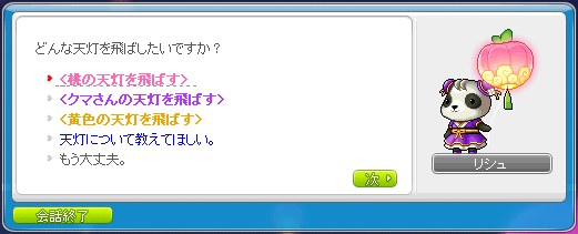- NPCリシュに話しかけて<黄色の天灯を飛ばす>を選択すると、400メイプルポイントを消費して黄色の天灯を飛ばすことができます。