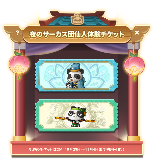 - ※イベント「仙人体験チケット」は、2025年11月12日(水)開始のイベント「白草村のイケイケ船上パーティー」とサーカスコインのデイリー獲得上限を共有するため、2つのイベントで1日に獲得できるサーカスコインの上限が合計300です。
