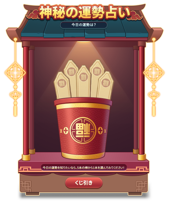 - 神秘の運勢占いUIが表示されますので、「くじ引き」ボタンを押して棒を混ぜた後、5本の棒の中から1本を選んでください。