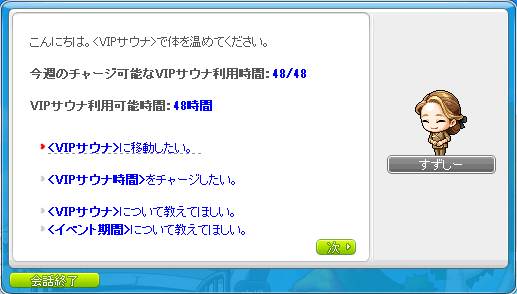 からイベントリストを開き「[経験値イベント]VIPサウナ」を選択して「参加する」ボタンを押してイベントに参加します。 - 「VIPサウナ利用券」(30分)を使用するか、400メイプルポイント(1時間)を使用すると、